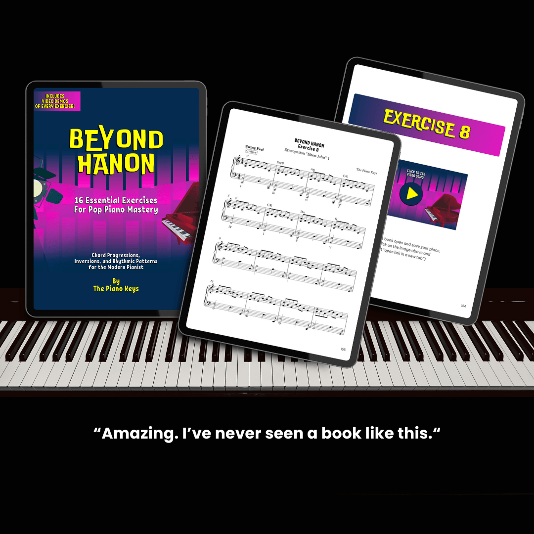 16 exercises that sound like pop/rock songs and teach your hands how to easily groove through common rhythm and chord patterns. Each exercises is notated in every key and includes video demonstrations.