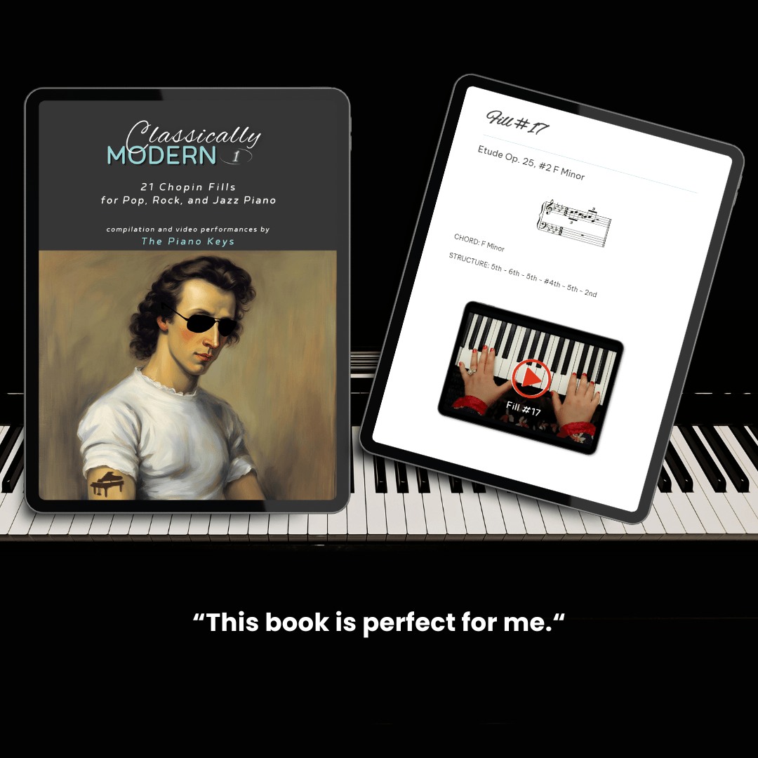 21 beautiful and versatile fills taken directly from Chopin's pieces. Use them whenever you need to "fill space" in your pop/rock/jazz/country songs. Each fill is notated, explained, and demonstrated on video.